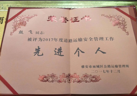 12月27日上午,雨城區(qū)運管所組織召開“2017道路運輸企業(yè)安全生產(chǎn)工作總結(jié)表彰大會”,我公司分管負責(zé)人甄飛代表公司參加會議,本年,我公司從內(nèi)部管理著手在安全生產(chǎn)工作中加強監(jiān)管力度,完善制度保障,取得成效得到了行業(yè)主管部門的認可,本次大會,我公司獲得了“雨城區(qū)2017年度道路運輸安全管理工作”先進單位,我公司安全經(jīng)營工作分管領(lǐng)導(dǎo)甄飛榮獲“2017年度道路運輸安全管理工作”先進個人。我公司一定不負榮譽,2018年繼續(xù)狠抓安全生產(chǎn)工作,保障藝峰旅游轉(zhuǎn)型發(fā)展。
